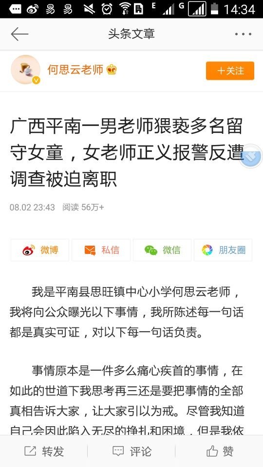 今年5月份,贵港平南县思旺镇中心小学十多名女童遭到校外托管机构一男教师猥亵,一名女教师报了警。然而不久之后,这名女教师发微博称,自己遭到教育部门的打击报复,被迫离开了学校。一时间,舆论哗然……
